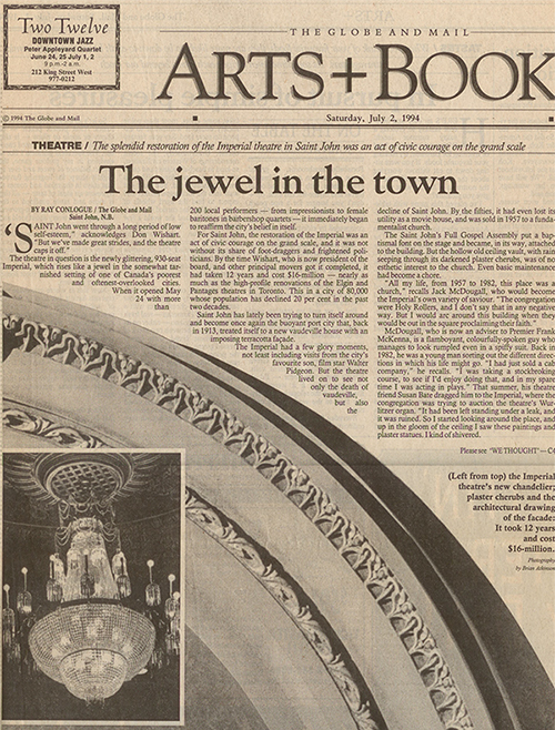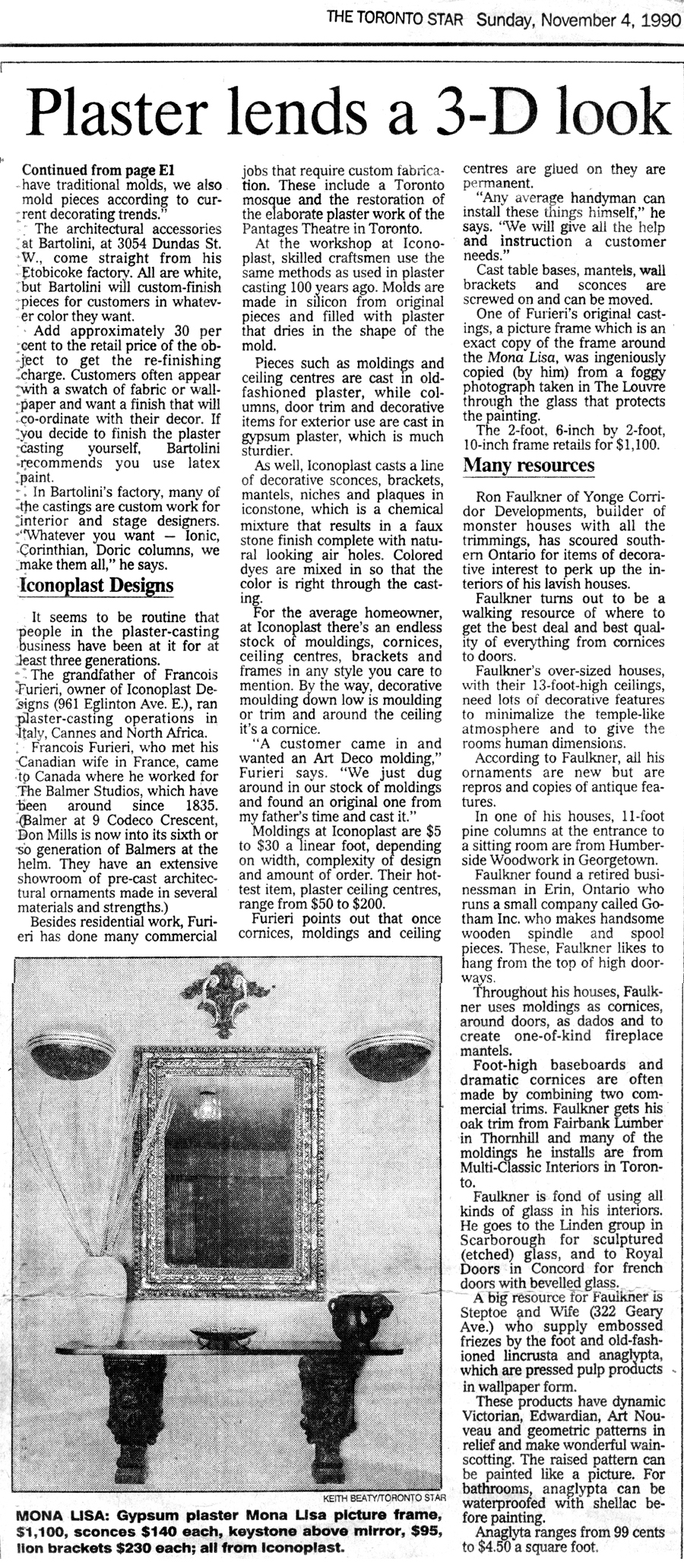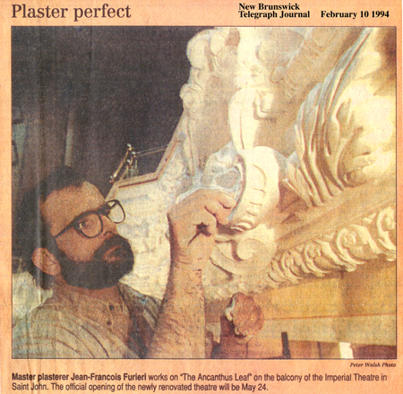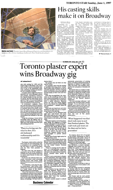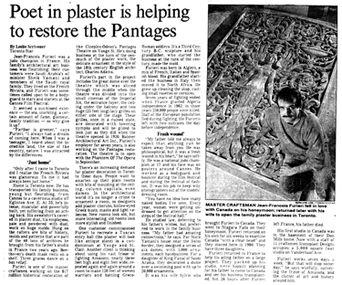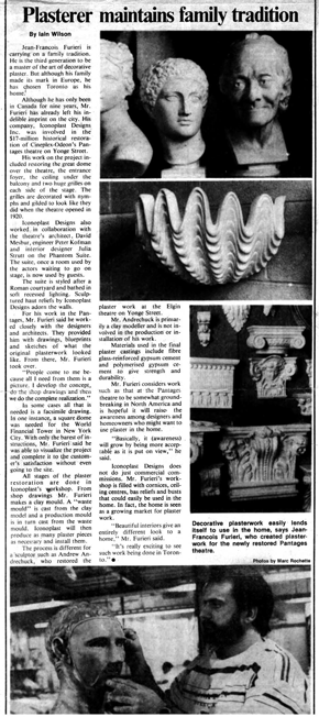 “Iconoplast Designs was involved in the $17-million historical restoration of Cineplex-Odeon’s Pantages Theatre . Furieri’s work on the project included restoring the great dome over the theatre, the entrance foyer, the ceiling under the balcony and two huge grilles on each side of the stage.â€