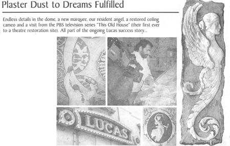 “Endless details in the dome, a new marquee, our resident angel, a restored ceiling cameo and a visit from the PBS television series “This Old House†(their first ever to a theatre restoration site.) All part of the ongoing Lucas success story.â€